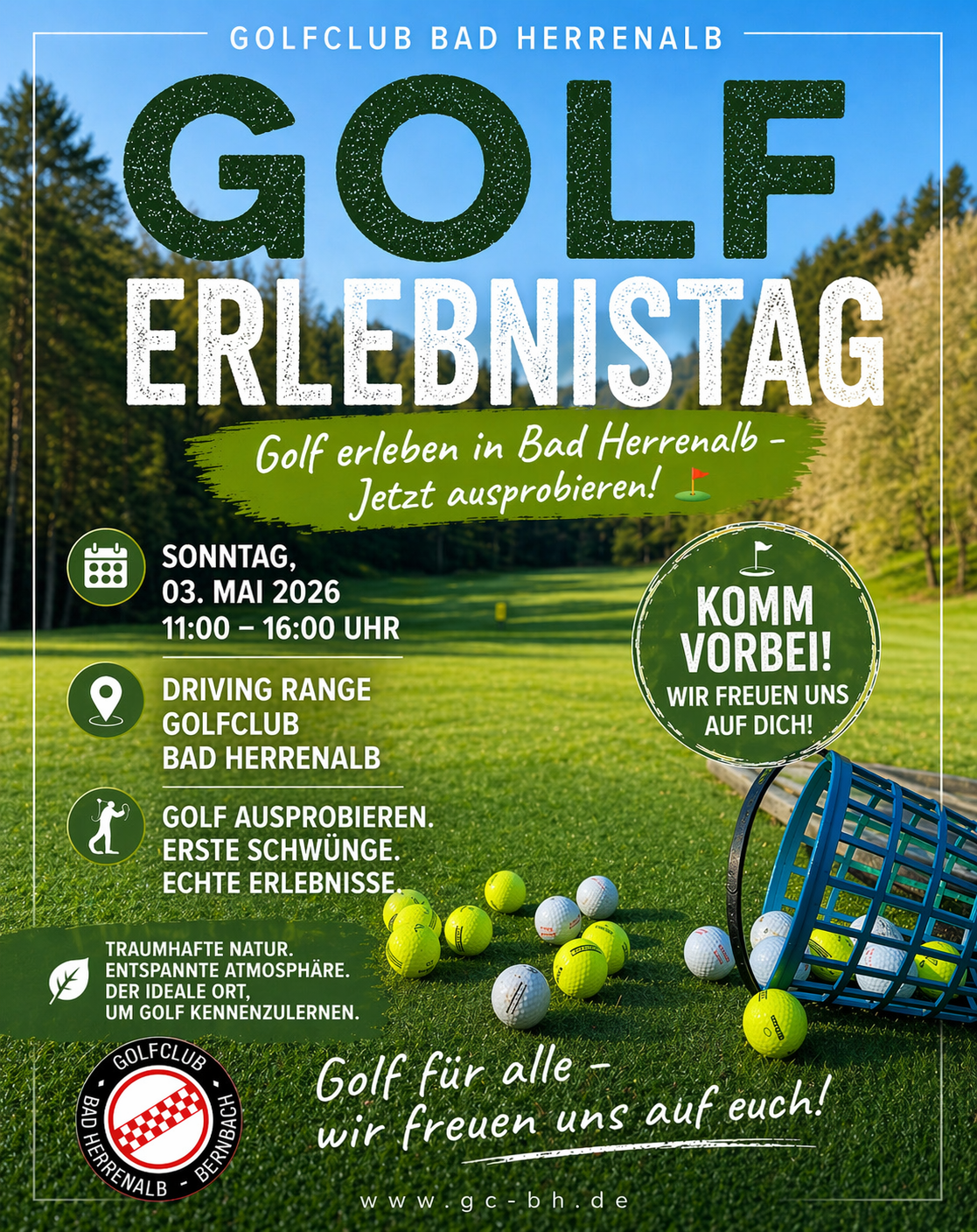 Golf-Erlebnistag am 03. Mai 2026 Am Sonntag, den 03. Mai 2026, öffnet der Golfclub Bad Herrenalb seine Türen für alle, die den Golfsport ganz unkompliziert kennenlernen möchten. Unser Golf-Erlebnistag bietet die perfekte Gelegenheit, erste Eindrücke zu sammeln – ganz